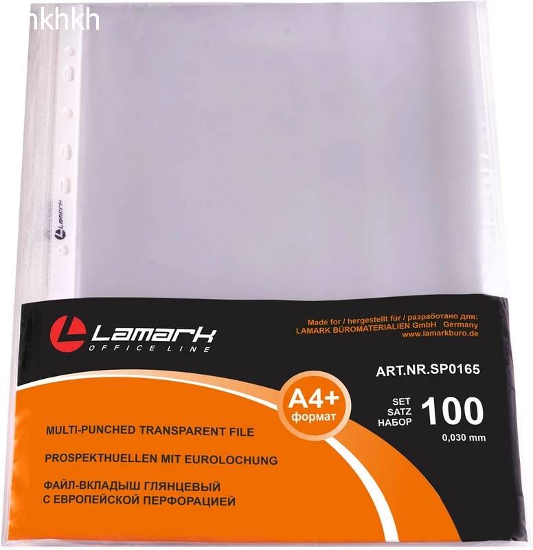 Файлы-вкладыши Lamark А4+ глянцевые выполнены из высококачественной полипропиленовой пленки толщиной 0,030 мм, снабжены универсальной перфорацией, предназначены для хранения и транспортировки неперфорированных документов, 100 штук в упаковке.