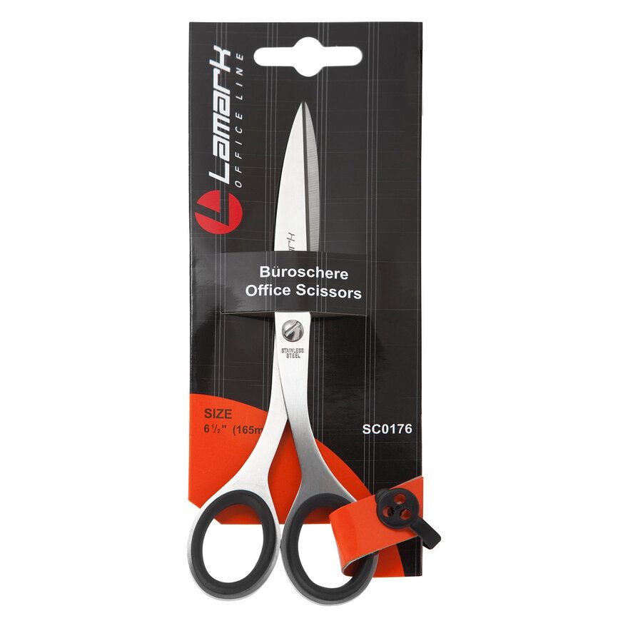 Ножницы канцелярские цельнометаллические Lamark из нержавеющей стали, с симметричными кольцами, с резиновыми вставками. Размер 16,5 см. Поставляются в блистере с еврослотом.