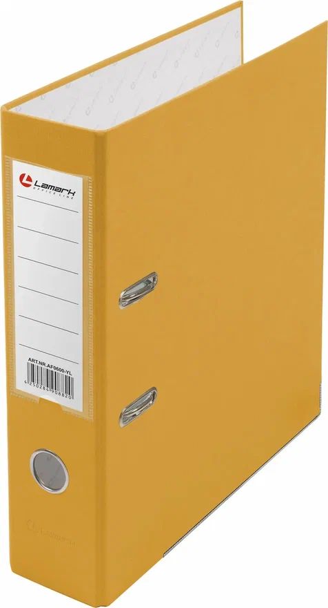 Папка-регистратор LAMARK РР с арочным механизмом изготовлена из плотного картона, с внешней стороны заламинированного полипропиленовой пленкой (РР) с текстурой "лен", внутри оклеена бумагой с алфавитно-цифровым полем для классификации на левой стороне. Прорези на крышке удерживают папку закрытой даже при большом количестве документов. Ширина корешка 80 мм. Вместимость до 480 листов формата А4. Нижние края защищены металлическим кантом, что сохраняет папку при длительной интенсивной эксплуатации. Карман со сменной индексной вставкой на корешке. Цвет желтый. Поставляются в разобранном виде по 50 штук в транспортной упаковке.