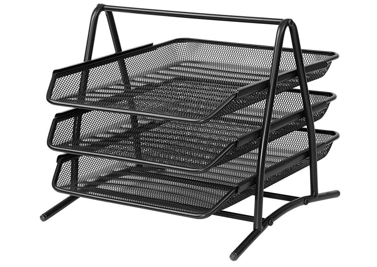 Лоток для бумаг 3-секционный горизонтальный. Выполнен из металлической сетки черного цвета.
